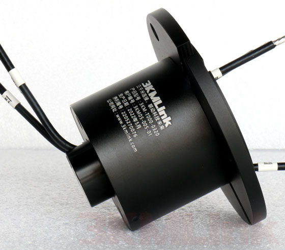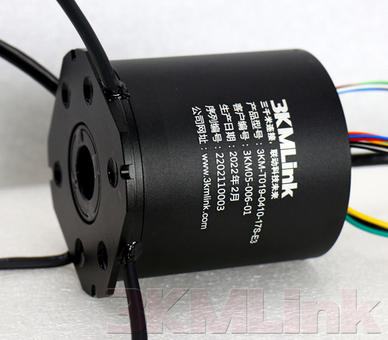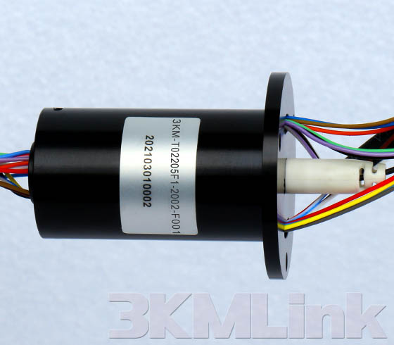 3KM T-series slip ring is designed with a through hole for shaft mounting, the through hole sizes are from 12.7mm to 124.6mm. it could be applied to transmit power, signals, RF, gas and fluid when the devices require 360° rotating.